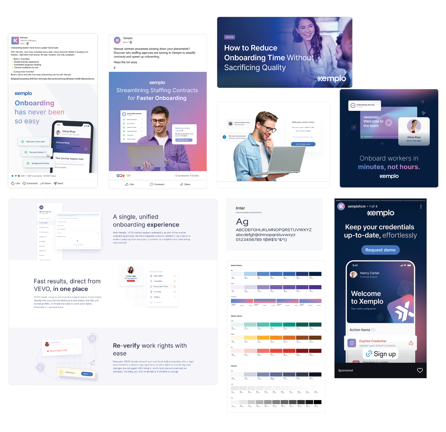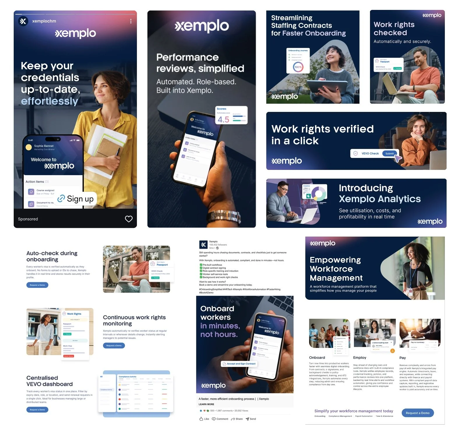 I wanted Xemplo to move away from lifeless UI screens and cliché ‘posed’ stock images to highlight that the focus is on the people, not just the platform itself. I also introduced a ‘Holding Shape’ to frame the subject and make them more central to the theme.